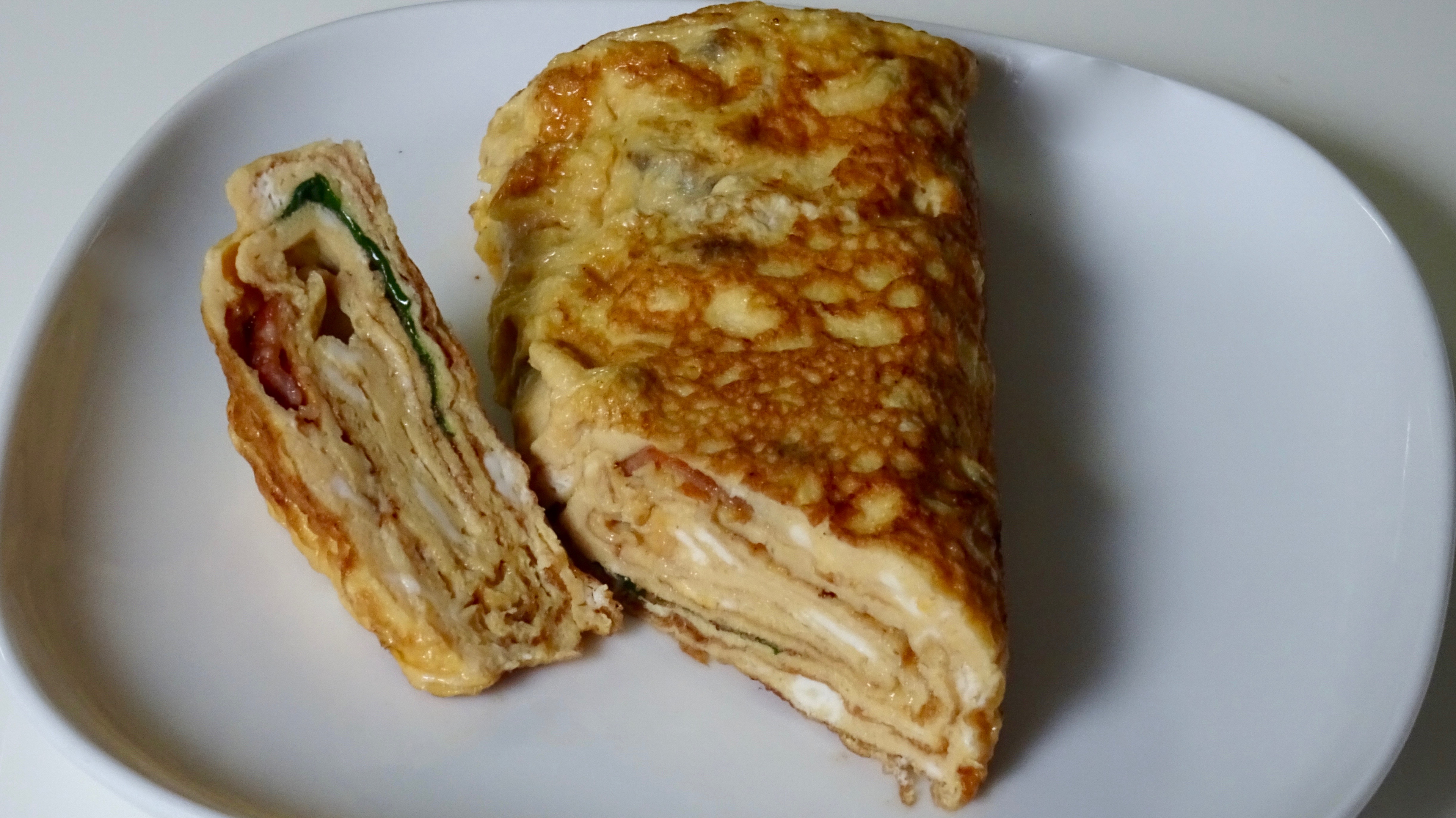 Comme je vous l’expliquais dans la recette d’omelette japonaise traditionnelle, j’ai ajouté plusieurs ingrédients, mais j’ai gardé la méthode de cuisson. On s’en régale au moins une fois par semaine depuis que j’ai ma nouvelle poêle. Voici la recette préférée de mon fils.