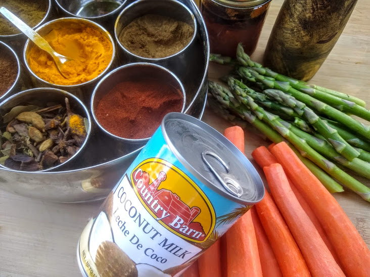 Incorporer les carottes et les asperges, mettre les liquides (bouillon et lait de coco), couvrir et laisser mijoter doucement 20 minutes ou jusqu’à ce que les légumes soient tendres.